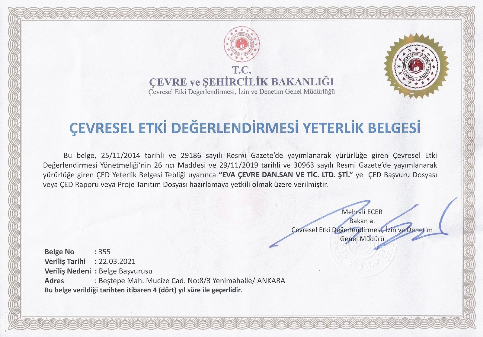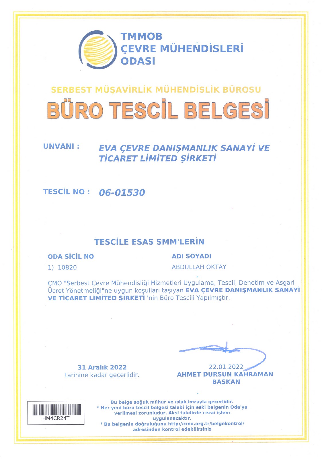 Çevresel Etki Değerlendirmesi Yeterlik Belgesi ve Çevre Mühendisleri Odası Büro Tescil Belgesi